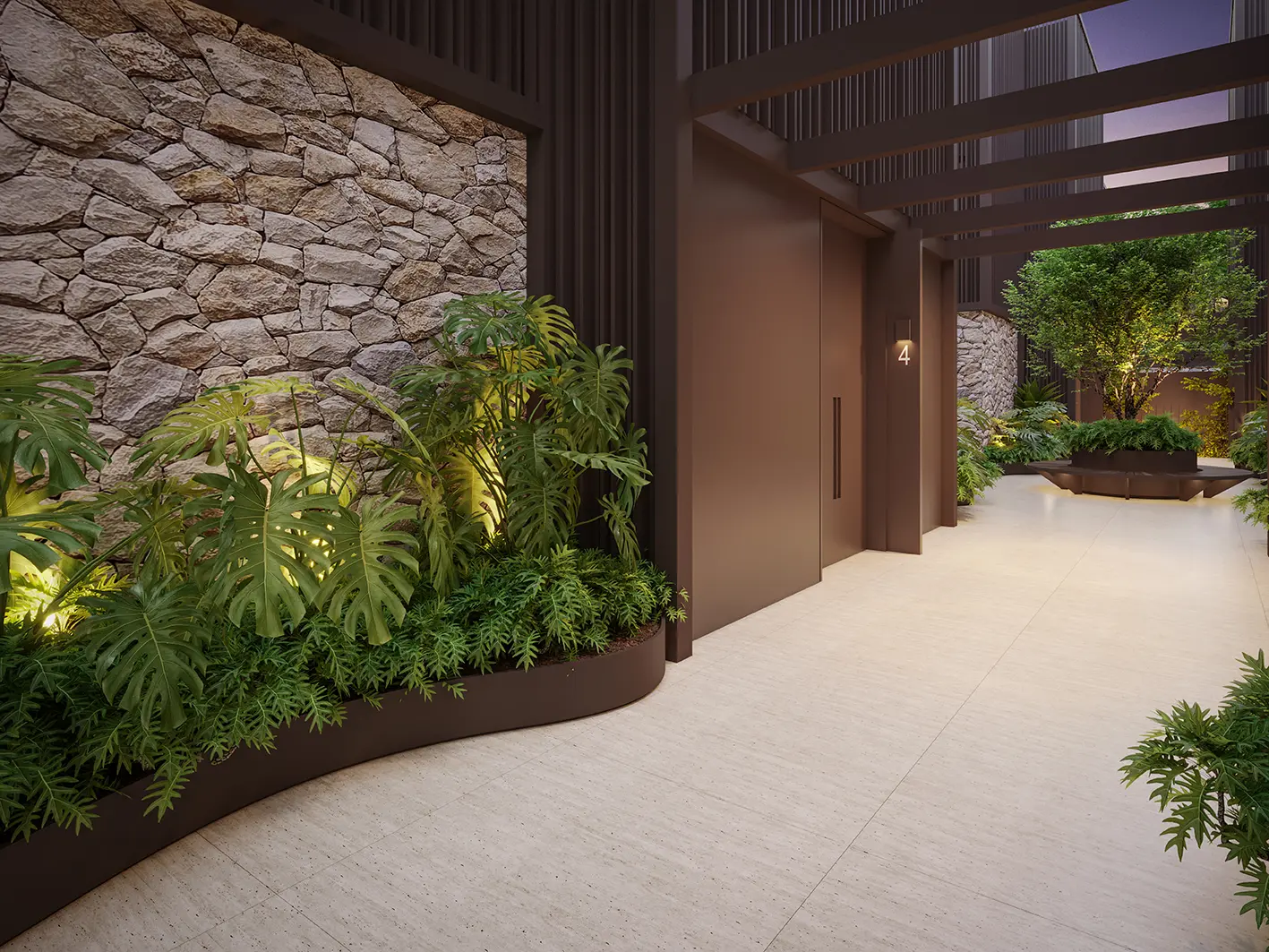 Este espaço único oferece sofisticação e elegância. A garagem conta com sete vagas privativas conectadas ao hall exclusivo, enriquecida por um jardim integrado com iluminação natural. O acabamento das paredes e o brise no teto criam uma atmosfera onde funcionalidade e beleza se harmonizam.