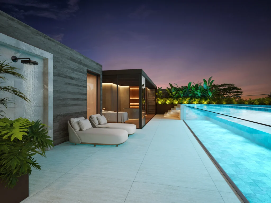 Perspectiva ilustrativa do Rooftop W privativo: piscina com raia privativa